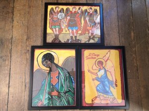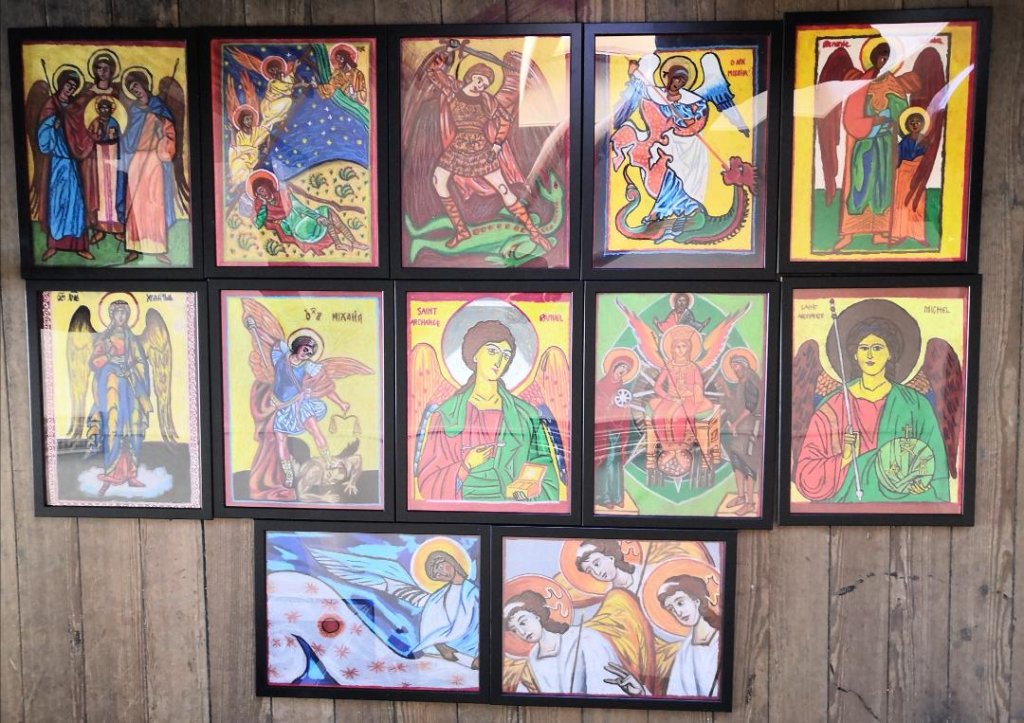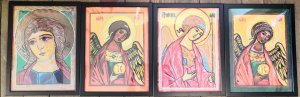 Les élèves de 3TQ Art et de 3ème de 4ème TT sciences sociales et éducatives ont dû choisir des icônes d’anges et les reproduire avec la technique du pastel à l’huile. Les élèves de 4ème et 5ème TQ Art ont quant à eux utilisé la technique de l’enluminure et créé également des interprétations plus modernes du thème.
