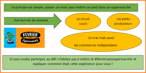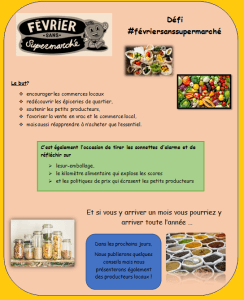 Les élèves ont donc décidé de lancer un défi à leur entourage avec #févriersanssupermarché. Celui-ci n’a pas pour but le boycott des grandes surfaces mais s’inscrit dans un esprit de réflexion sur la manière de consommer au quotidien et le partage de « bons plans » pour consommer autrement.